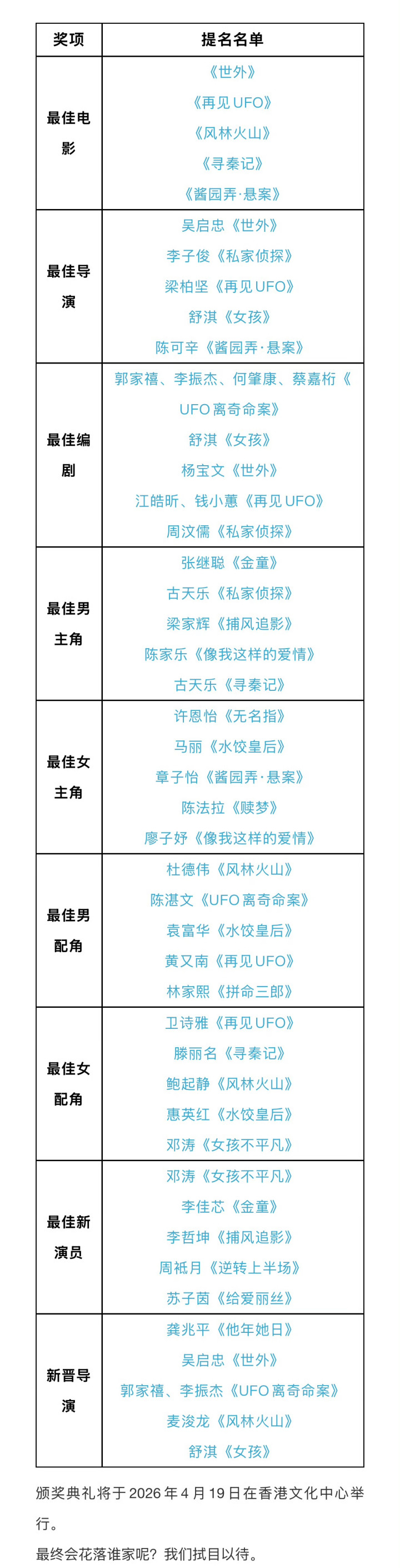 近日,第44届香港金像奖公布提名名单。