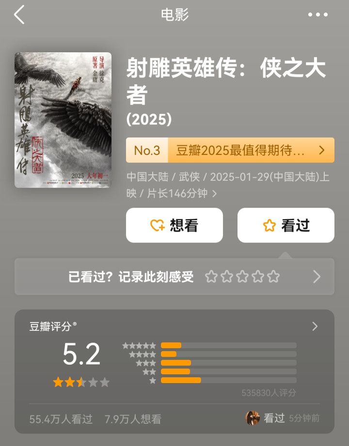 由著名武侠导演徐克指导,内娱断层顶流肖战主演的《射雕英雄传:侠之大者》于2025年大年初一上映,上映当天就斩获了过亿的票房。