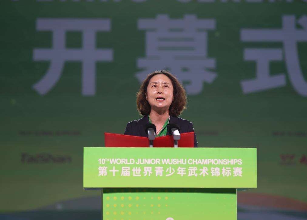 3月25日,张玉萍在第十届世界青少年武术锦标赛开幕式上致开幕词。新华社记者 孙凡越 摄